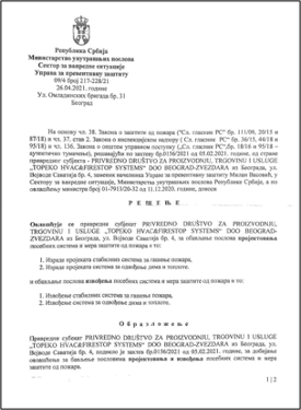 Topeko HVAC&Firestop Systems doo je rešenjem MUP- a RS broj 217-228/21 ovlašćen za projektovanje i izvođenje posebnih sistema i mera zaštite od požara (stabilnih sistema za gašenje požara) i sistema za odvođenje dima i toplote, po važećoj zakonskoj regulativi Republike Srbije.